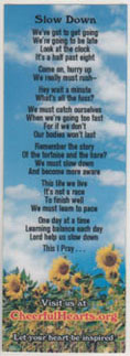 What better way to remind yourself to “Slow Down” or to be inspired, than with one of our lovely bookmarks. Each displays a combination of beautiful scenery and inspiring poetry, laminated for long lasting durability.