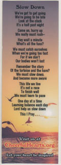 What better way to remind yourself to “Slow Down” or to be inspired, than with one of our lovely bookmarks. Each displays a combination of beautiful scenery and inspiring poetry, laminated for long lasting durability.